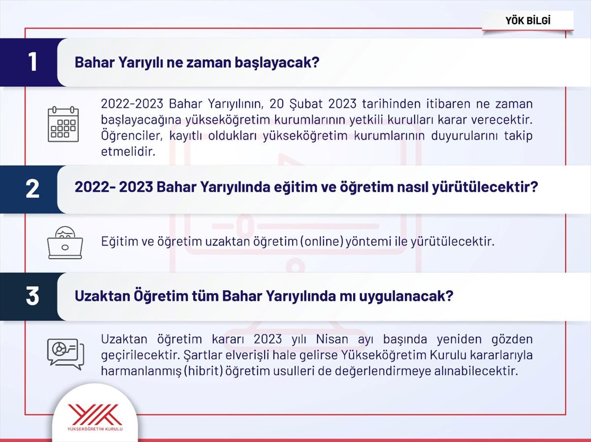 Uzaktan öğretim kararı, 2023 yılı nisan ayı başında yeniden gözden geçirilecek. Şartlar elverişli hale gelirse Yükseköğretim Kurulu kararlarıyla harmanlanmış (hibrit) öğretim usulleri de değerlendirmeye alınabilecek.