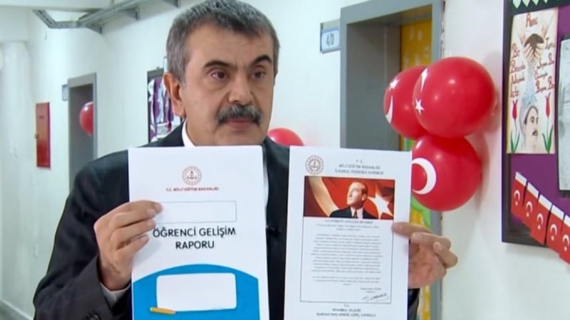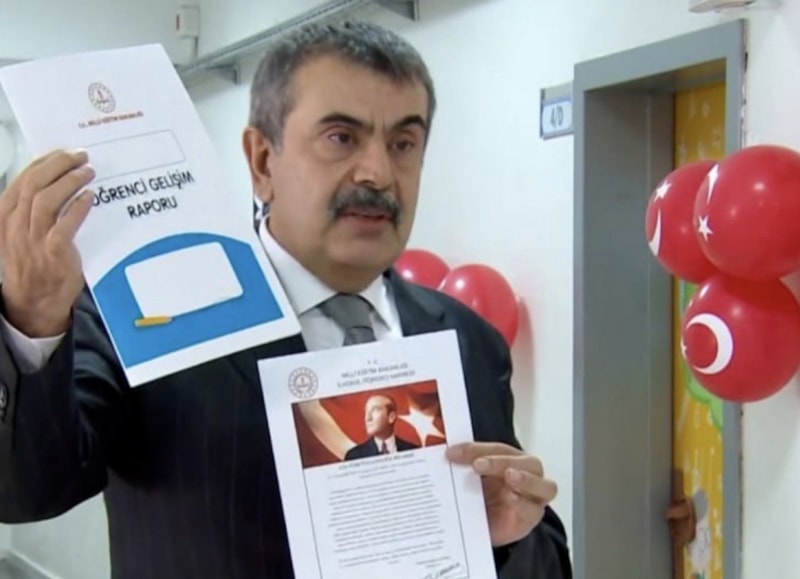 Karnelerde Gazi Mustafa Kemal Atatürk'ün fotoğrafının kaldırılmadığını dile getiren Tekin, karne ile gelişim raporunu yan yana kameralara gösterdi.