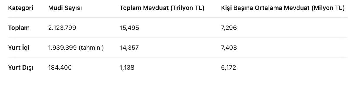 Sadece yurt içinde yerleşik mudilerin toplam mevduatı 14 trilyon 356 milyar 744 milyon lira seviyesinde gerçekleşti. Bu tutarın 9,7 trilyon lirası TL cinsi, 3,7 trilyon lirası döviz tevdiat hesabı ve 870 milyar lirası kıymetli maden depo hesaplarında yer aldı. Yurt içi mudi başına ortalama mevduat ise 7 milyon 402,7 bin lira oldu.