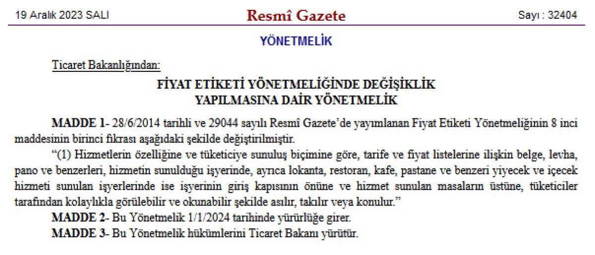 Bakanlığın "Fiyat Etiketi Yönetmeliğinde Değişiklik Yapılmasına Dair Yönetmeliği", Resmi Gazete'de yayınlandı.
