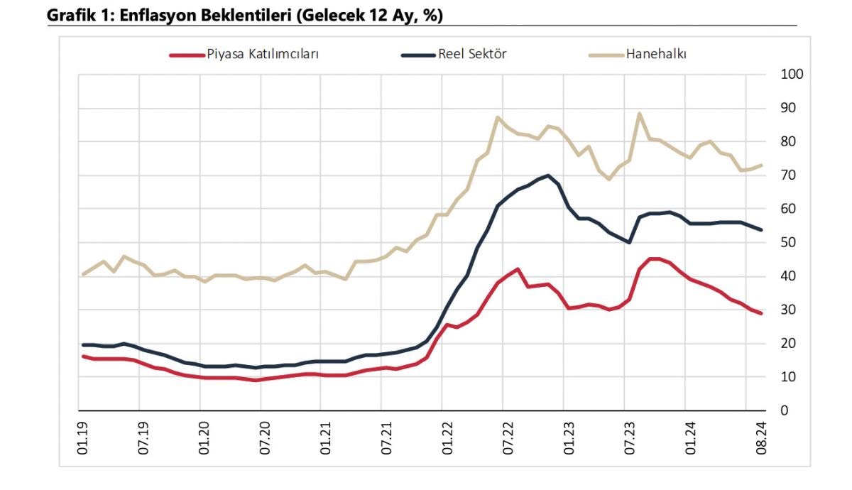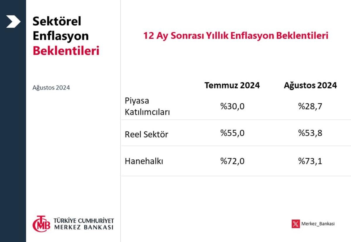 2024 yılı Ağustos ayında 12 ay sonrası yıllık enflasyon beklentileri, piyasa katılımcıları için 1,3 puan azalarak yüzde 28,7 seviyesine, reel sektör için 1,2 puan azalarak yüzde 53,8 seviyesine gerilerken, hanehalkı için 1,1 puan artarak yüzde 73,1 seviyesine çıktı.