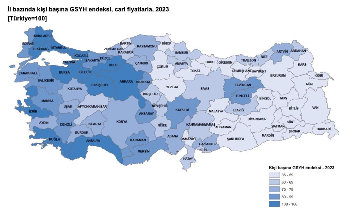 İl düzeyinde cari fiyatlarla Gayrisafi Yurt İçi Hasıla (GSYH) hesaplamalarına göre; 2023 yılında İstanbul 8 trilyon 60 milyar 358 milyon TL ile en yüksek GSYH'ye ulaştı ve toplam GSYH'den yüzde 30,4 pay aldı. İstanbul'u, 2 trilyon 538 milyar 686 milyon TL ve yüzde 9,6 pay ile Ankara, 1 trilyon 614 milyar 161 milyon TL ve yüzde 6,1 pay ile İzmir izledi. İl düzeyinde GSYH hesaplarında son üç sırada 22 milyar 13 milyon TL ile Tunceli, 19 milyar 407 milyon TL ile Ardahan ve 13 milyar 214 milyon TL ile Bayburt yer aldı.