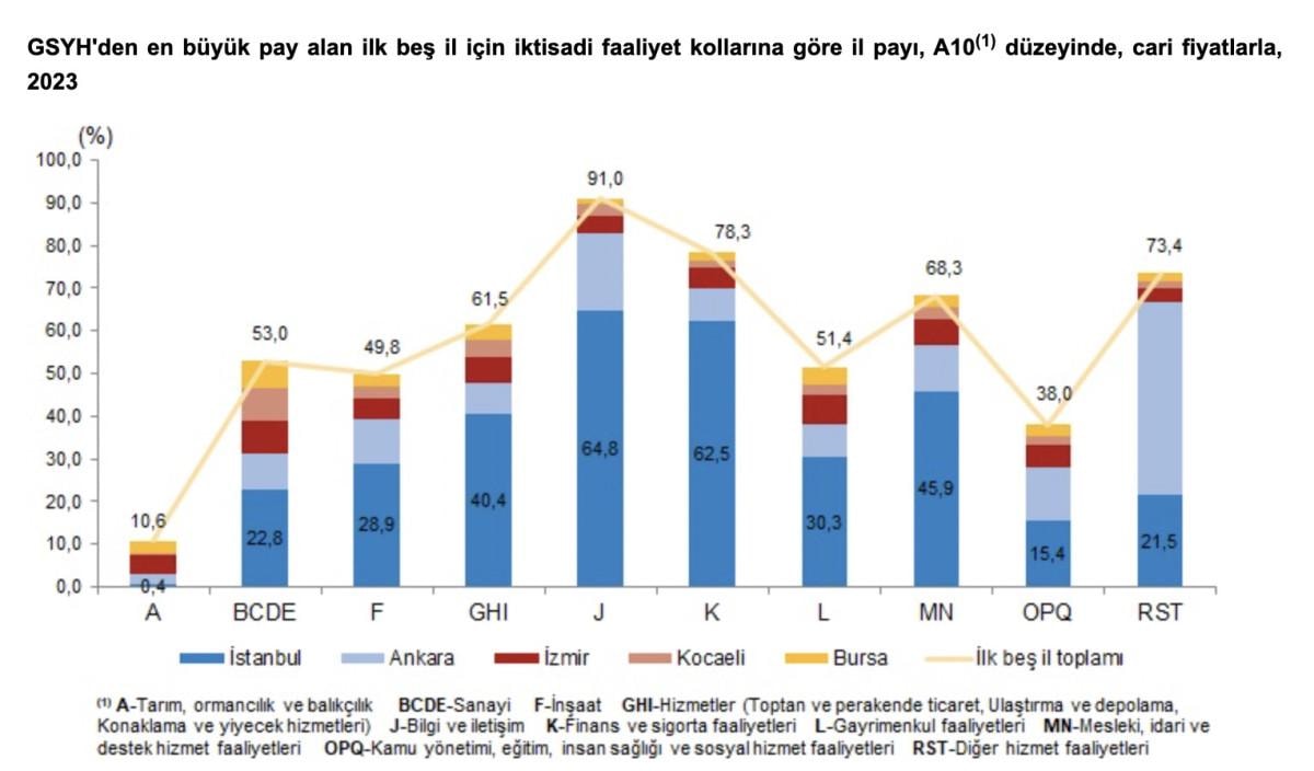 GSYH'den en yüksek payı alan ilk beş il, 2023 yılında toplam GSYH'nin yüzde 54,02'sini oluşturdu.
