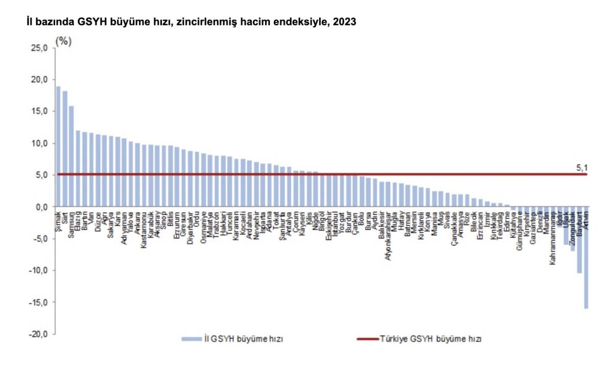 Yıllık GSYH, zincirlenmiş hacim endeksiyle 2023 yılında bir önceki yıla göre yüzde 5,1 artarken, 44 ilde Türkiye ortalamasının üzerinde artış gerçekleşti. Bir önceki yıla göre 2023 yılında en yüksek artış gösteren ilk üç il sırasıyla yüzde 18,9 değişim oranı ile Şırnak, yüzde 18,2 ile Siirt ve yüzde 15,8 ile Samsun oldu. Bir önceki yıla göre en yüksek azalış gösteren üç il ise sırasıyla yüzde 6,9 ile Zonguldak, yüzde 10,4 ile Bayburt ve yüzde 16,0 değişim oranı ile Artvin oldu.