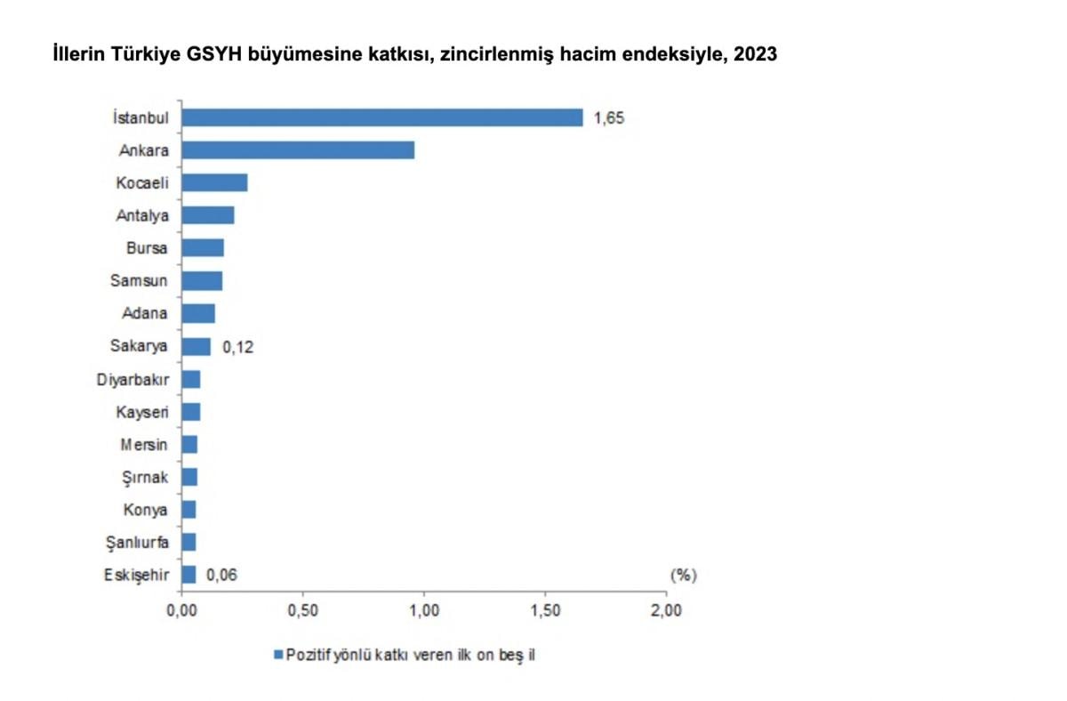 İstanbul'u yüzde 0,96 ile Ankara ve yüzde 0,27 ile Kocaeli izledi. Yıllık GSYH büyümesine 2023 yılında negatif yönlü katkı veren illerin başında yüzde 0,03 ile sırasıyla Zonguldak, Artvin ve Gaziantep yer aldı.