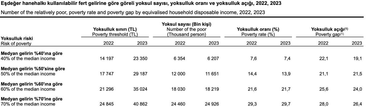 Eşdeğer hanehalkı kullanılabilir fert medyan gelirinin yüzde 50'si dikkate alınarak belirlenen yoksulluk sınırına göre, yoksulluk oranı 2023 yılında 0,5 puan azalarak yüzde 13,9 oldu.