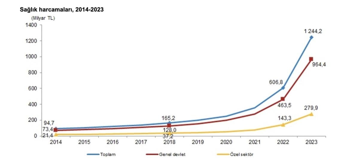 Toplam sağlık harcaması 2023 yılında bir önceki yıla göre yüzde 105 artarak 1 trilyon 244 milyar 237 milyon TL'ye yükseldi. Genel devlet sağlık harcaması yüzde 108,1 artarak 964 milyar 355 milyon TL'ye ulaştı. Özel sektör sağlık harcaması ise yüzde 95,3'lük bir artış oranı ile 279 milyar 883 milyon TL olarak tahmin edildi.
