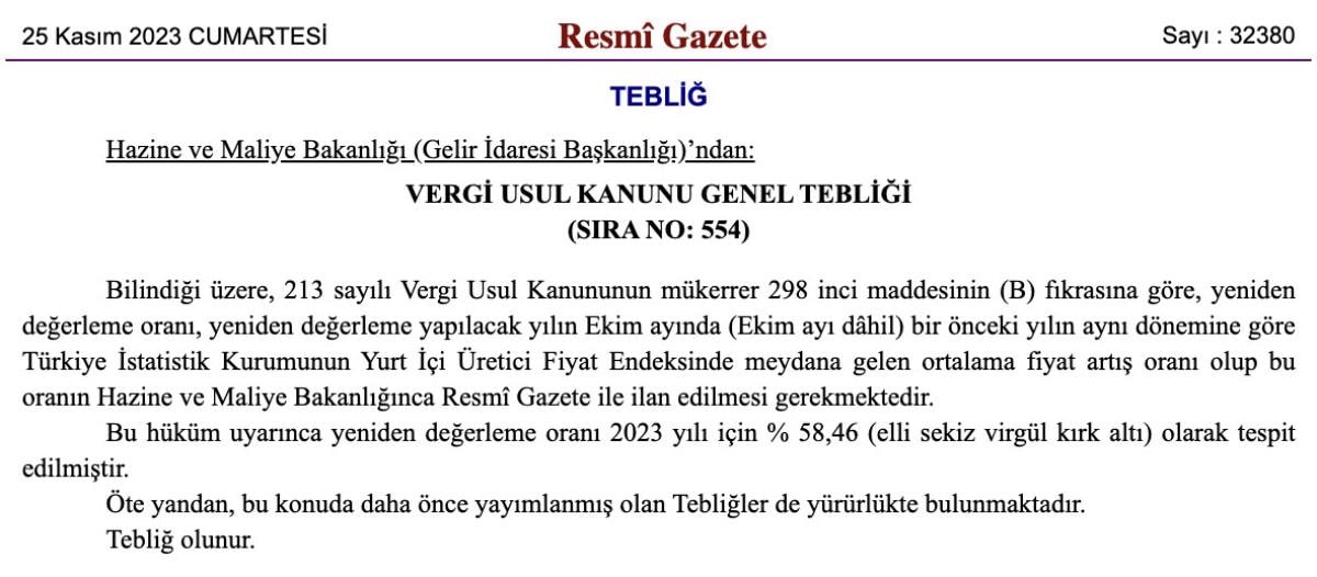 Bu kapsamda yeniden değerleme oranının 2023 yılı için yüzde 58,46 olarak tespit edildiği kaydedildi.