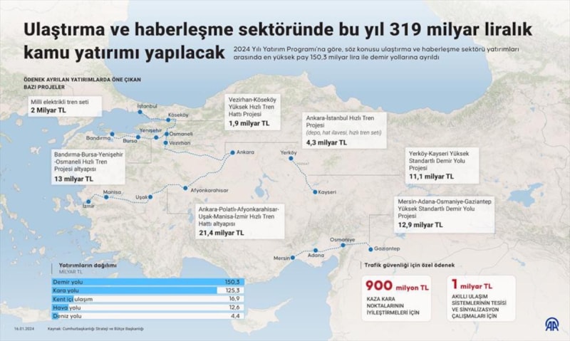 Bandırma-Bursa-Yenişehir-Osmaneli Hızlı Tren Projesi altyapısı için 13 milyar 45 milyon lira, Ankara-İstanbul Hızlı Tren Projesi'nde depo, hat ilavesi, hızlı tren seti için 4 milyar 319 milyon lira, Vezirhan-Köseköy Yüksek Hızlı Tren Hattı Projesi için 1,9 milyar lira ayrıldı.