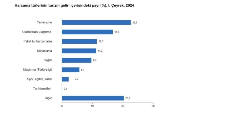 Bu çeyrekte turizm geliri içerisindeki yeme içme harcamalarının payı yüzde 22,6, uluslararası ulaştırma harcamalarının payı yüzde 16,7, paket tur harcamalarının payı ise yüzde 11,5 oldu. Bir önceki yılın aynı dönemine göre yeme içme harcamaları yüzde 2,8, uluslararası ulaştırma harcamaları yüzde 11,8 ve paket tur harcamaları yüzde 19,4 arttı.