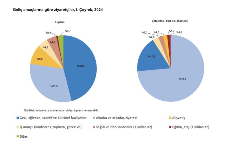 İkinci sırada yüzde 31,3 ile "akraba ve arkadaş ziyareti", üçüncü sırada ise yüzde 9,6 ile "alışveriş" yer aldı. Yurt dışı ikametli vatandaşlar ise Türkiye'ye yüzde 73,6 ile en çok "akraba ve arkadaş ziyareti" amacıyla geldi.