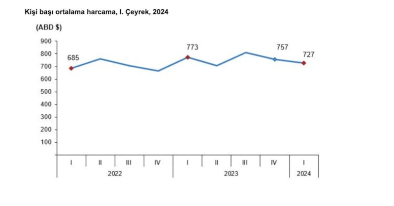 Bu çeyrekte Türkiye'den çıkış yapan ziyaretçilerin gecelik ortalama harcaması 93 dolar oldu. Yurt dışında ikamet eden vatandaşların gecelik ortalama harcaması ise 64 dolar oldu.