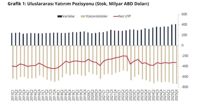 2025 yılı Aralık ayı itibarıyla TCMB'nin açıkladığı verilere göre, Türkiye'nin uluslararası yatırım pozisyonu -324,9 milyar ABD doları olarak kaydedildi. Yurt dışı varlıklarındaki artış yüzde 2,6 oldu.