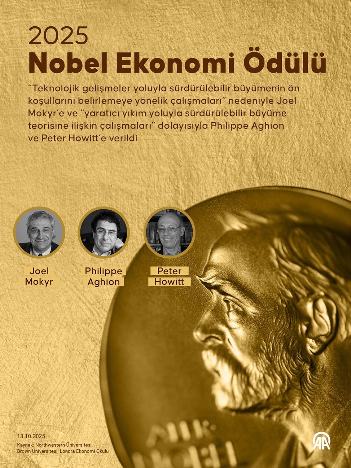 - 2025 Nobel Ekonomi Ödülü, Joel Mokyr, Philippe Aghion ve Peter Howitt'e "yenilik odaklı ekonomik büyümeyi açıkladıkları" için verildi.