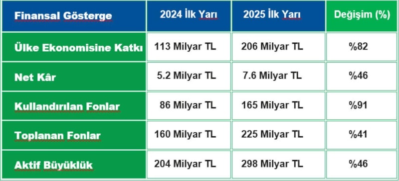 Geçtiğimiz yılın aynı dönemine göre %82 artışla ülke ekonomisine 206 Milyar TL kaynak sağlayan Emlak Katılım, aynı dönemde net kârını %46 oranında artırarak 7.6 Milyar TL’ye çıkardı. Aktif büyüklüğünü 298 Milyar TL’ye ulaştıran Emlak Katılım, toplanan fonlarını 225 Milyar TL’ye yükseltti. Aynı dönemde kullandırılan fon büyümesi %91 düzeyinde gerçekleşirken %1.02 seviyesindeki takibe dönüşüm oranı ve %21,93’lük sermaye yeterliliği oranı ile sektördeki sağlam duruşunu pekiştirdi. Güçlü sermaye yapısı ve etkin risk yönetimiyle desteklenen istikrarlı operasyonel faaliyetleri sayesinde 2025 yılı ilk yarısında özkaynak kârlılığını %69 seviyesinde tamamladı.
