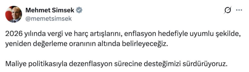 Hazine ve Maliye Bakanı Mehmet Şimşek, sosyal medya hesabından 2026 yılında vergi ve harç artışlarının yeniden değerleme oranının altında olacağını belirtti.