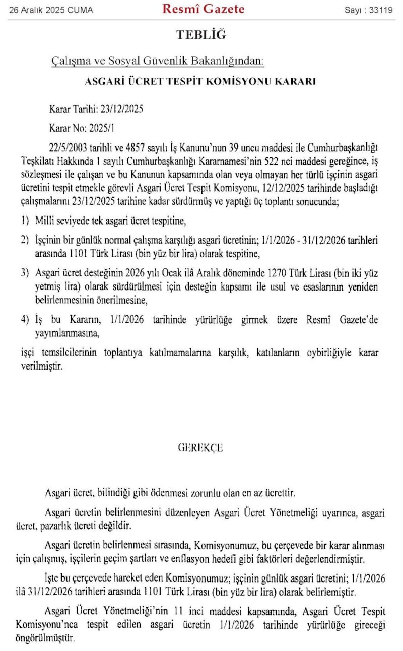 Çalışma ve Sosyal Güvenlik Bakanlığı Asgari Ücret Tespit Komisyonu'nun 2026 yılına ilişkin asgari ücret kararı Resmi Gazete'de yer buldu.