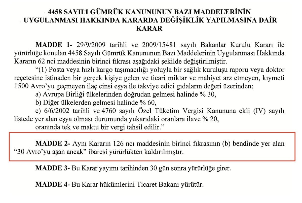 Resmi Gazete'de yayımlanan Cumhurbaşkanı Kararı ile yurt dışından 30 euroya kadar olan eşyaların posta veya kargoyla gümrüksüz getirilmesine izin veren 4458 Sayılı Gümrük Kanunu'nun Bazı Maddelerinin Uygulanmasında Karar Değişikliği Yapılmasına Dair Kanunu'nun 126. maddesinin birinci fıkrası, yürürlükten kaldırıldı.