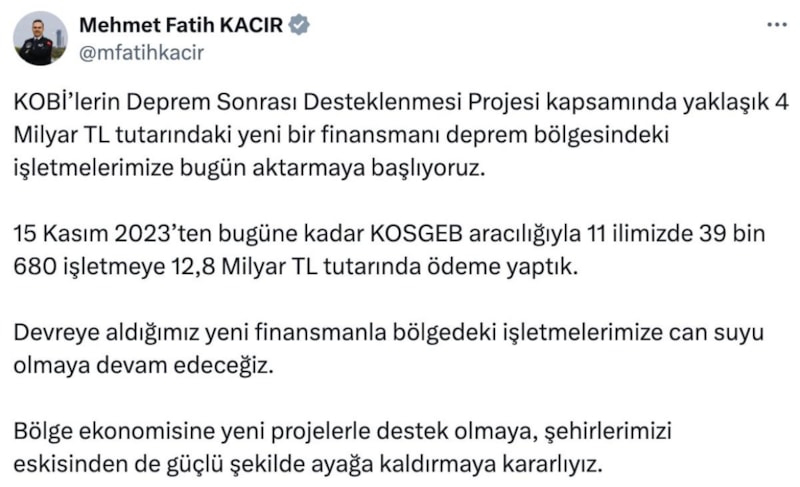 Sanayi ve Teknoloji Bakanı Fatih Kacır, sosyal medya üzerinden deprem bölgesindeki KOBİ'lere yapılacak desteklerle ilgili bilgi verdi.