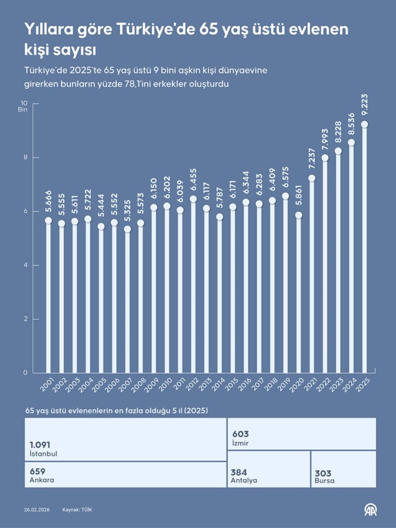 Türkiye İstatistik Kurumu (TÜİK) verilerine göre, 2021 yılında 65 yaş üstü 5 bin 666 kişi evlenirken 2025'e geldiğimizde bu sayı 9 bin 223'e çıktı.