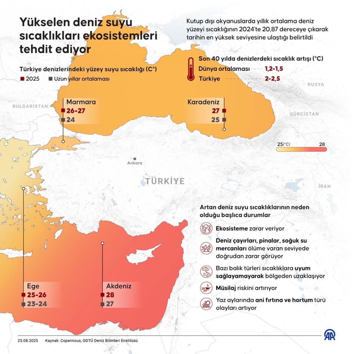 Uzun yıllar ortalamasının 24 derece olduğu Marmara Denizi'nde bu yaz deniz yüzey suyu sıcaklığı 26-27 derece, ortalamanın 25 derece olduğu Karadeniz'de ise 27 derece ölçüldü.