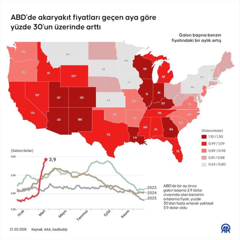 Amerikan Otomobil Derneği (AAA) ve GasBuddy verilerine göre, fiyat artışı özellikle Colorado, Utah, Arizona, New Mexico ve Wisconsin gibi eyaletlerde yoğunlaştı. Haritada koyu kırmızı ile gösterilen bu eyaletlerde galon başına fiyat artışı 1,10-1,30 dolar aralığında gerçekleşti.