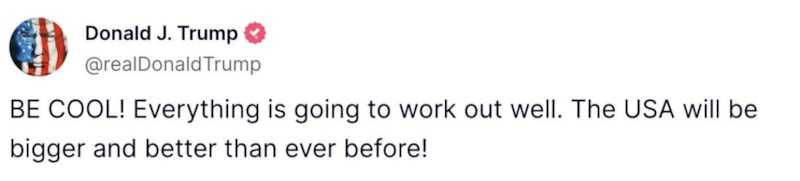 Donald Trump'ın yaşananlara tepkisi ise Kendisine ait Truth Social platformundaki hesabından "Sakin olun! Her şey oluna girecek. ABD her zamankinden daha büyük ve daha iyi olacak. DJT'de (Medya ve teknoloji grubu) satın alım için harika zaman." şeklinde oldu.