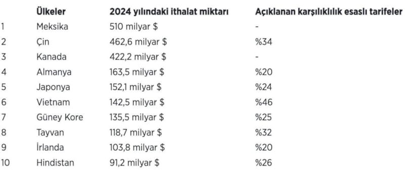 ABD'nin 2024 yılında en çok ithalat yaptığı 10 ülke (milyar dolar) ve açıklanan karşılıklılık esasları tarifeleri (yüzde) şöyle: