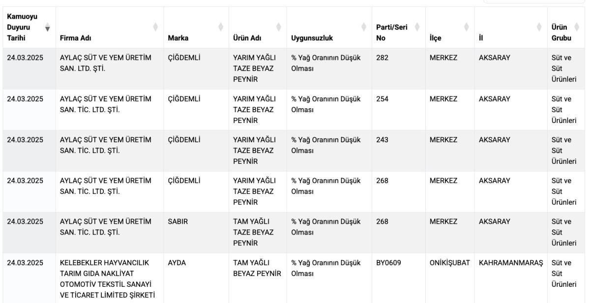 Kahramanmaraş ve Aksaray'da yarım ve tam yağlı taze beyaz peynirde yağ oranı düşük bulundu.