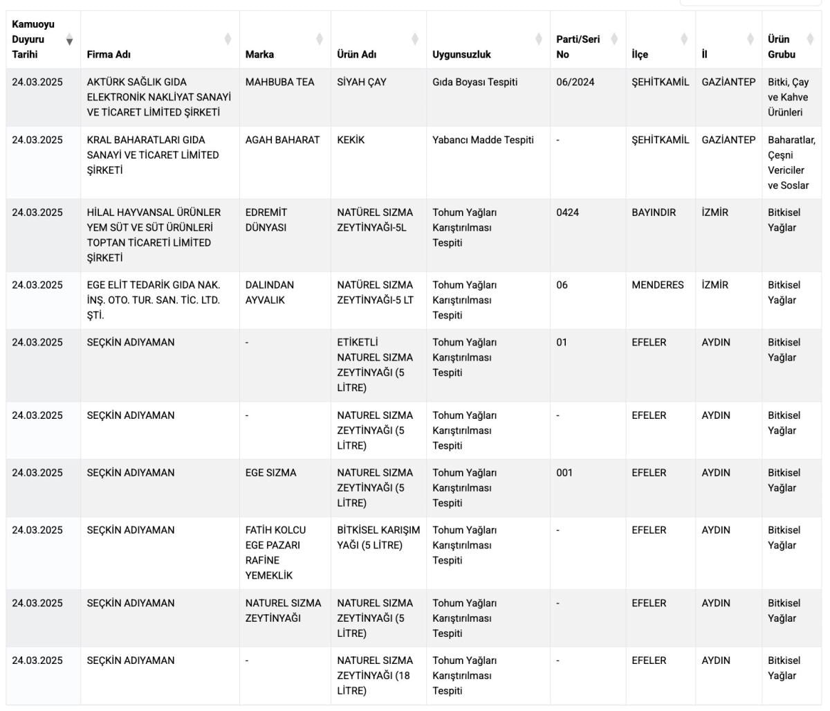 Taklit veya Tağşiş Yapılan Gıdalar (Temel özelliği etkileyen içerik eksikliği) listesine 6 yeni hileli ürün eklendi ve buradaki sayı 109 oldu.