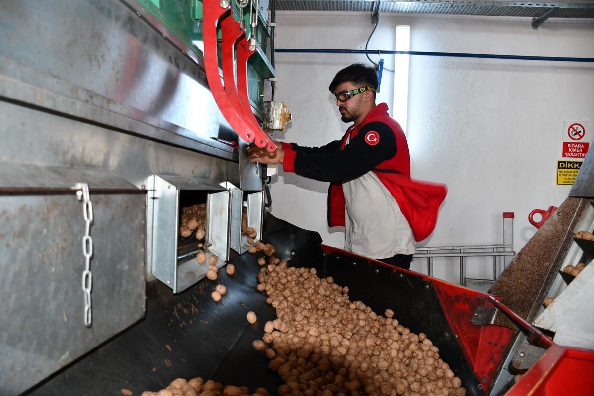 Hasat döneminde yaklaşık 500 kişinin çalıştığı bahçede kurulan makinalarla cevizler, bütün aşamalardan geçerek paketlenip sofralara hazır hale getiriliyor.
