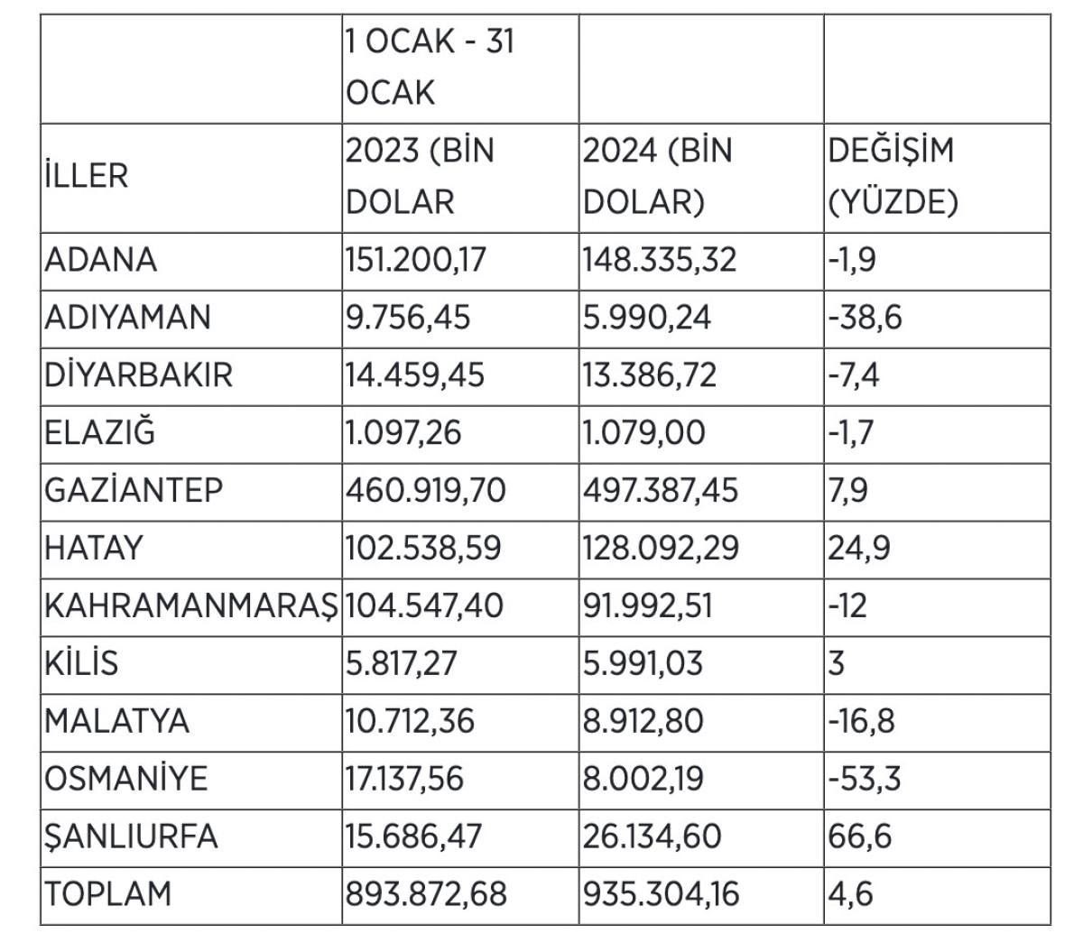 Adana, Adıyaman, Diyarbakır, Elazığ, Gaziantep, Hatay, Kahramanmaraş, Kilis, Malatya, Osmaniye ve Şanlıurfa'nın geçen ay yaptığı sanayi ihracatı, 2023'ün aynı dönemine göre yüzde 4,6 artarak 935,3 milyon dolara yükseldi.