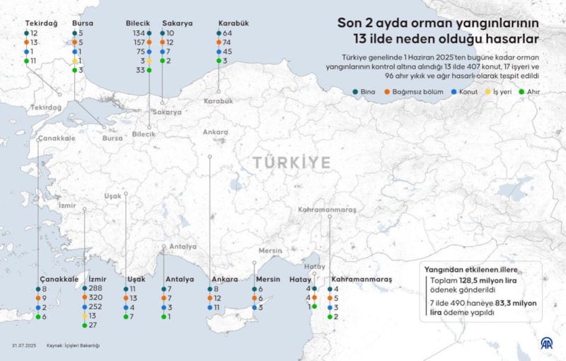 Türkiye genelinde son 2 ayda 13 ilde çıkan orman yangınlarında 407 konut, 17 iş yeri ve 96 ahır yıkık ya da ağır hasarlı olarak tespit edildi. Yangından etkilenen illere toplam 128,5 milyon lira ödenek gönderildi.
