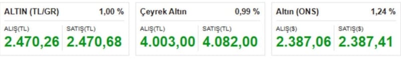 Buna göre gram altın 2 bin 470 liradan işlem görürken, çeyrek altın ise 4 bin 82 lira oldu.