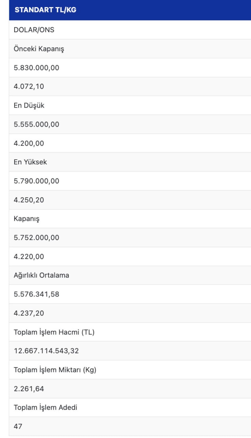 - Geçen hafta 5 milyon 830 bin liradan kapanan fiyat, bugün en düşük 5 milyon 555 bin lira ve en yüksek 5 milyon 790 bin lira seviyelerine ulaştı.