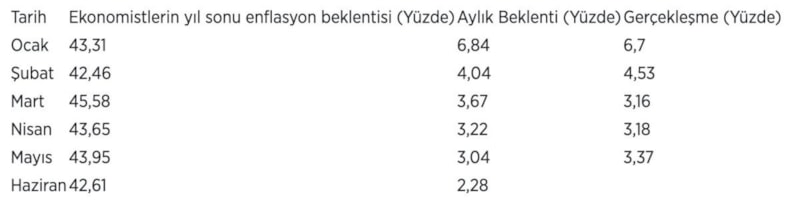Öte yandan, ekonomistlerin 2024 sonu enflasyon beklentisi haziranda yüzde 42,61 oldu.