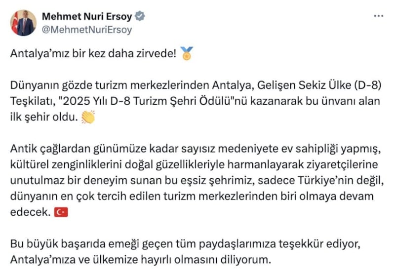 Kültür ve Turizm Bakanı Mehmet Nuri Ersoy, Antalya'nın, Gelişen Sekiz Ülke (D-8) Teşkilatı "2025 Yılı D-8 Turizm Şehri Ödülü"nü kazanarak bu ünvanı alan ilk şehir olduğunu bildirdi.
