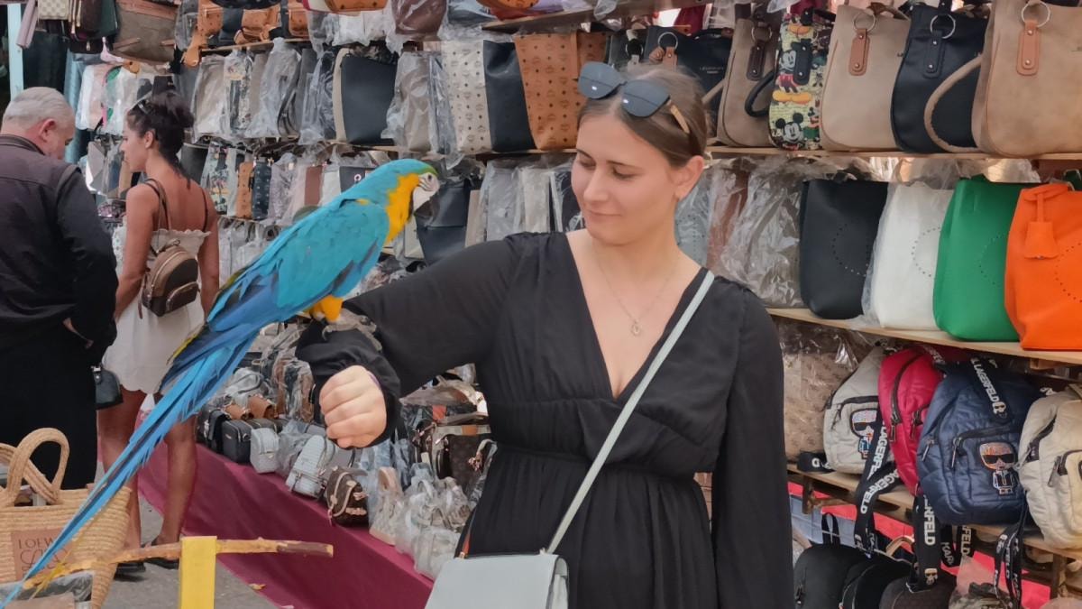 Pazarda çanta ve valiz satılan tezgahın girişindeki papağan ise, turistlerden ilgi görüyor. Tezgahın önünden geçen turistler, papağan ile fotoğraf çektirmeyi ihmal etmiyor.