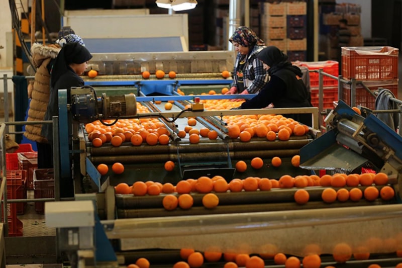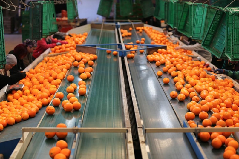 Hasat edilen portakallar bir yandan bahçelerden kasalarla traktörlere yüklenirken diğer yandan da ilçedeki tesislerde yıkanıp paketlendikten sonra nakli gerçekleştiriliyor.