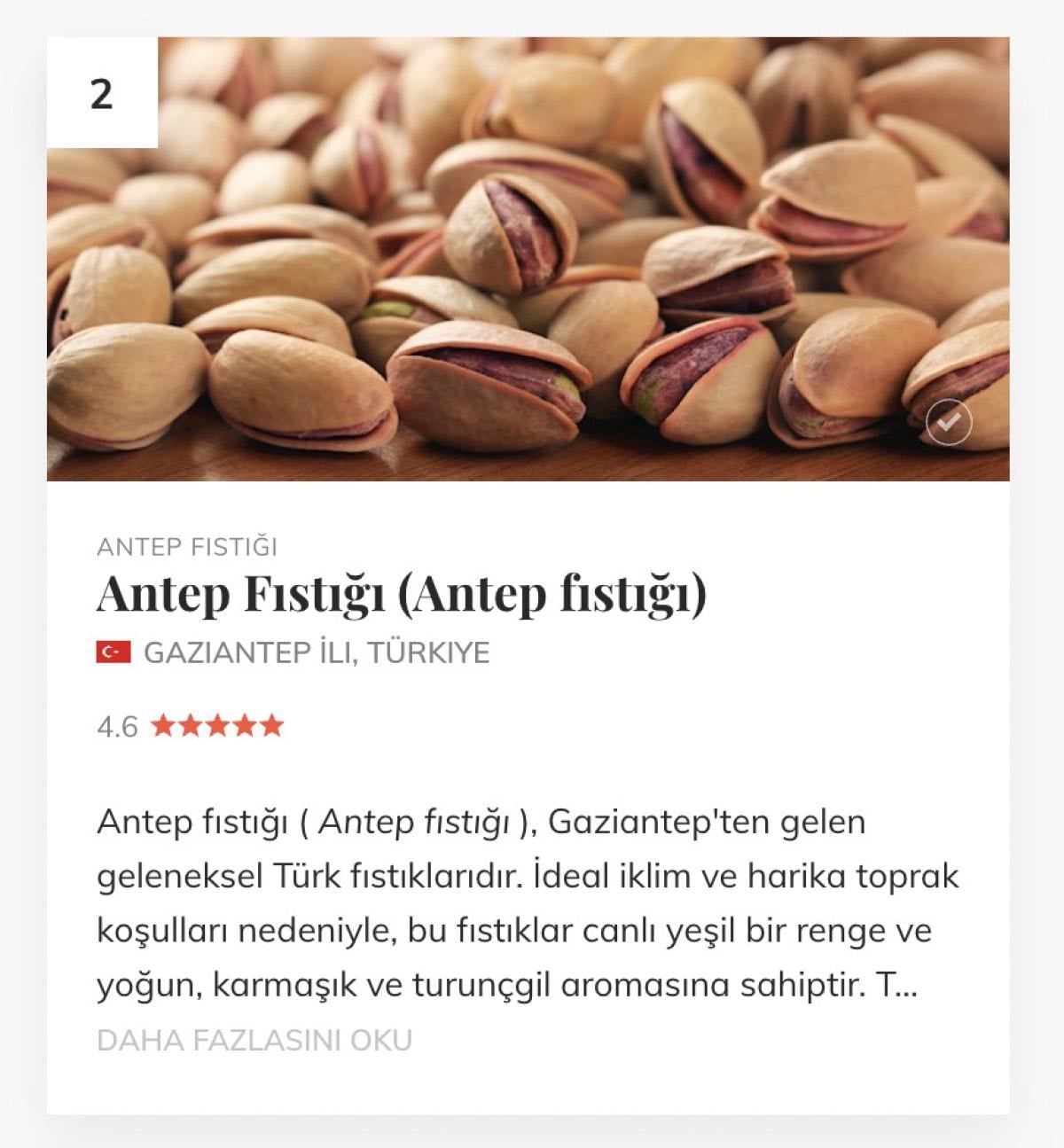 Dünyanın dört bir yanındaki yerel yemekler, içecekler ve restoranlar hakkında bilgi sunan interaktif harita ve bilgi platformunca hazırlanan "dünyanın en iyi 10 kuruyemişi" listesinde, Antep fıstığı 2. sırada yer aldı.