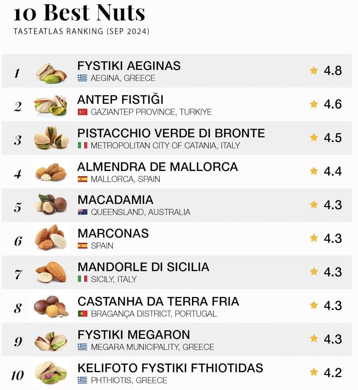 Yunanistan 3, İspanya ve İtalya ise Taste Atlas'ın kuruyemiş sıralamasında 2'şer kez yer aldı.