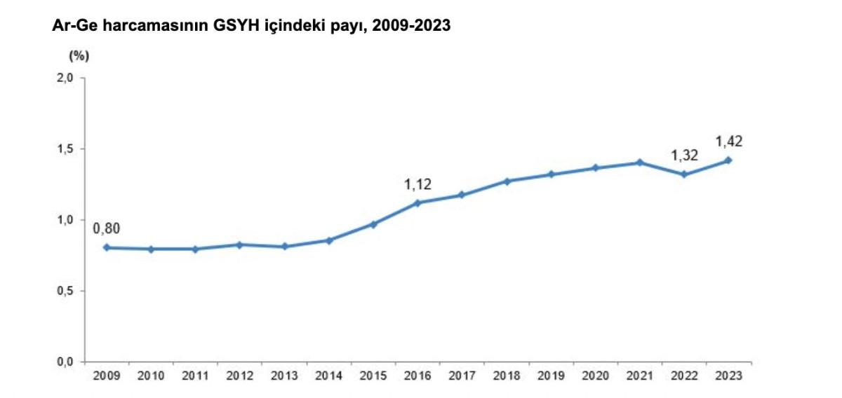 Gayrisafi yurt içi AR-GE harcamasının GSYH içindeki oranı 2022'de yüzde 1,32 iken, 2023'te 26 trilyon 545 milyar 722 milyon liralık GSYH içindeki oranı yüzde 1,42 oldu.