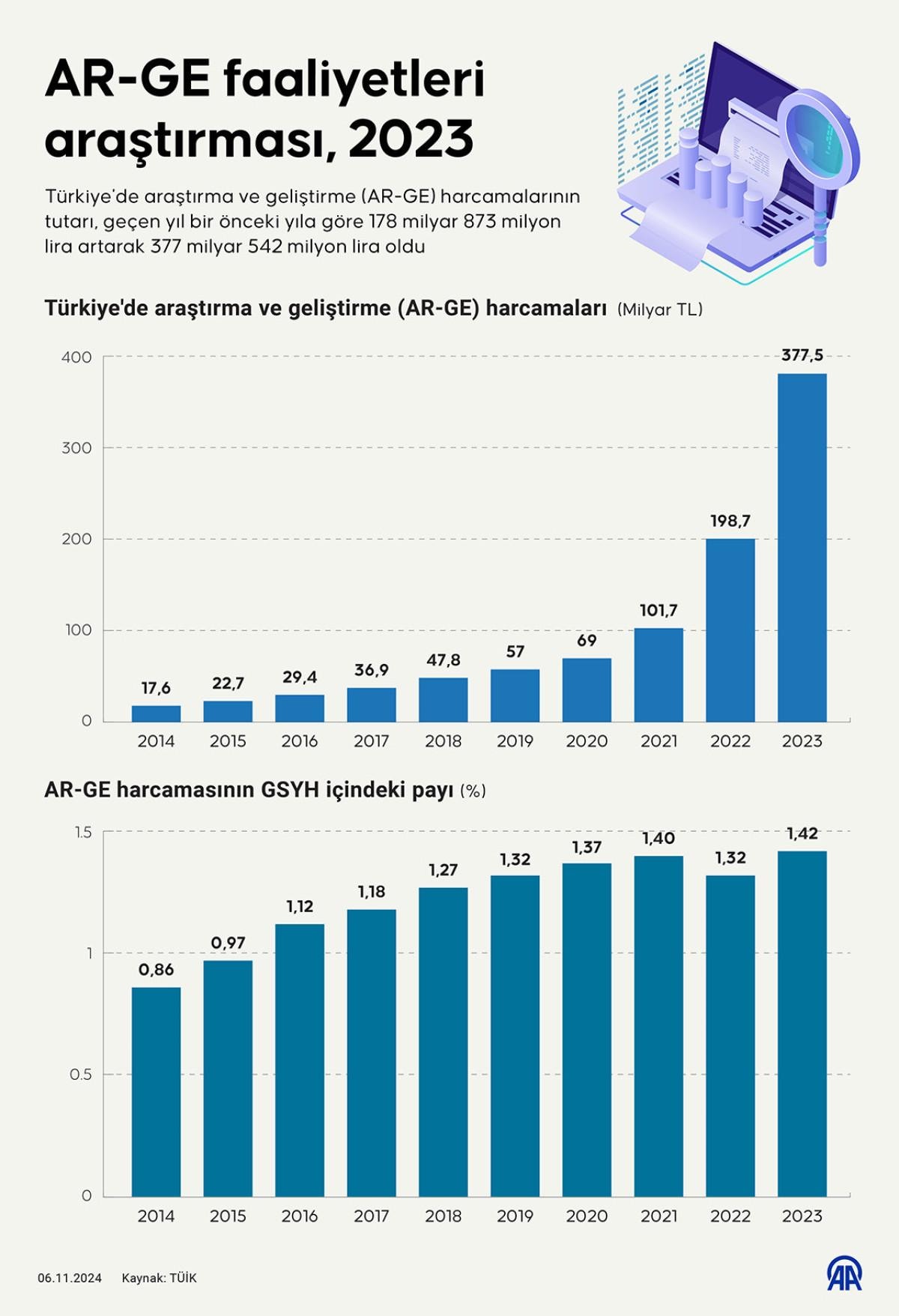 Araştırma-Geliştirme Faaliyetleri Araştırması 2023 sonuçlarına göre, gayrisafi yurt içi AR-GE harcaması 2023'te, bir önceki yıla göre 178 milyar 873 milyon lira artarak 377 milyar 542 milyon liraya çıktı.