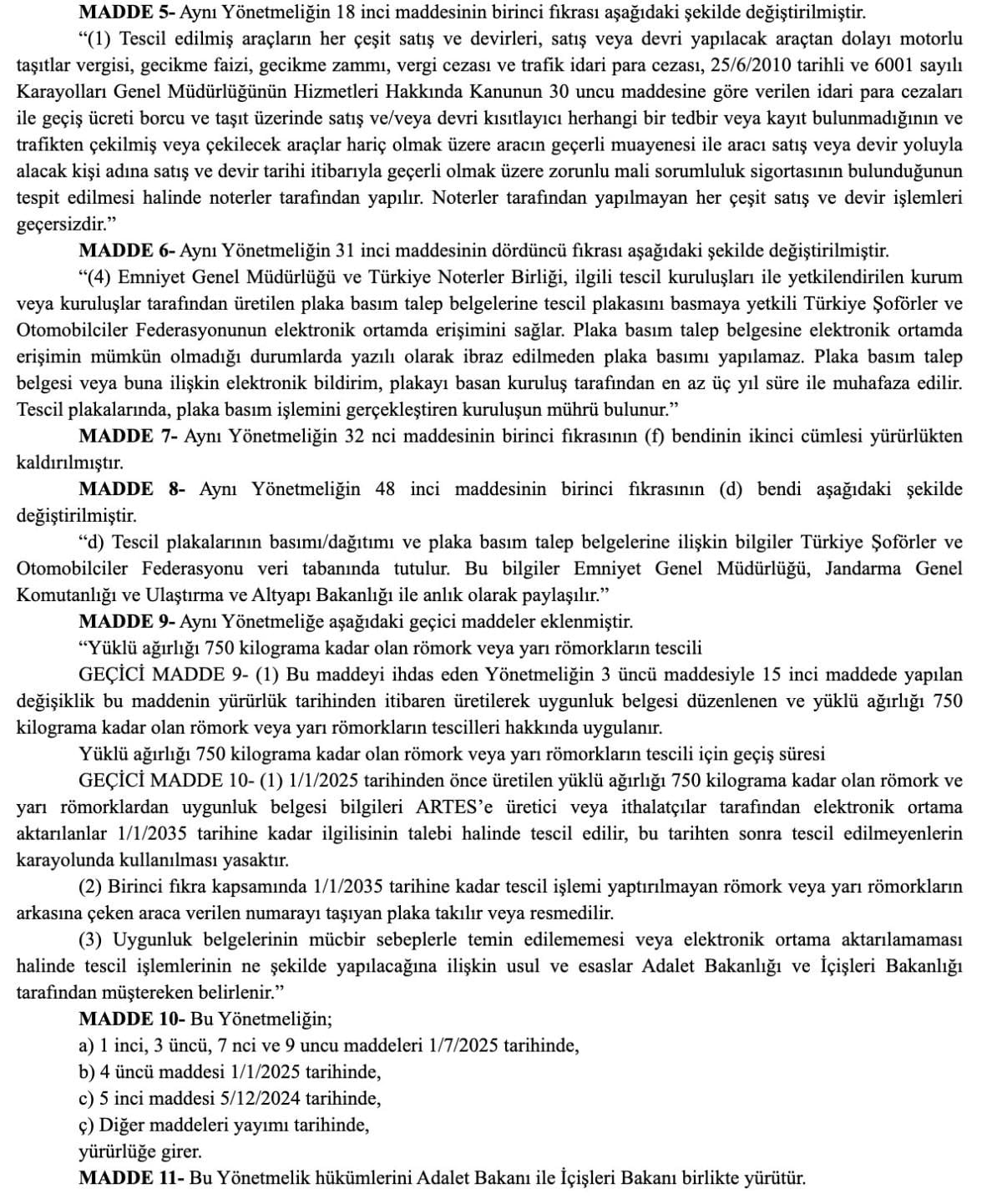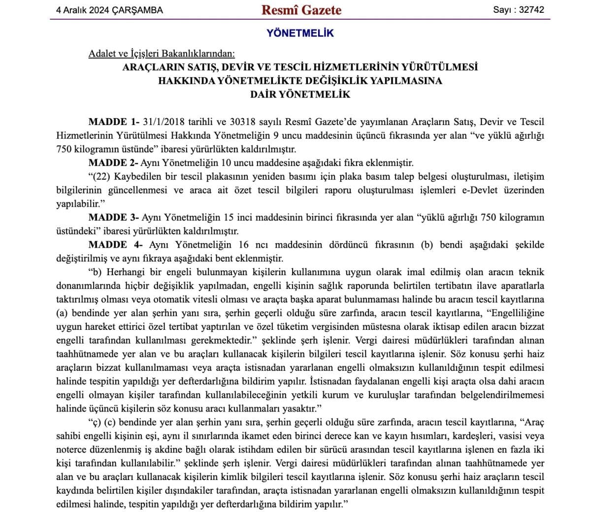 Araçların Satış, Devir ve Tescil Hizmetlerinin Yürütülmesi Hakkında Yönetmelikte Değişiklik Yapılmasına Dair Yönetmelik, Resmi Gazete'de yayımlandı.