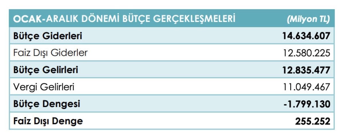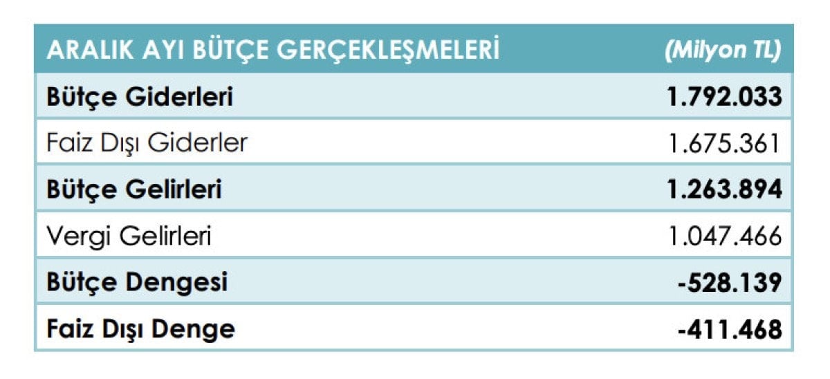 - Faiz dışı bütçe açığı ise Aralık ayında 411,5 milyar TL seviyesinde gerçekleşti.