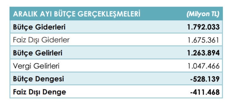 Buna göre, 2025 yılı Aralık ayında merkezi yönetim bütçe giderleri 1 trilyon 792 milyar TL, bütçe gelirleri 1 trilyon 263,9 milyar TL ve bütçe açığı 528,1 milyar TL olarak gerçekleşti.