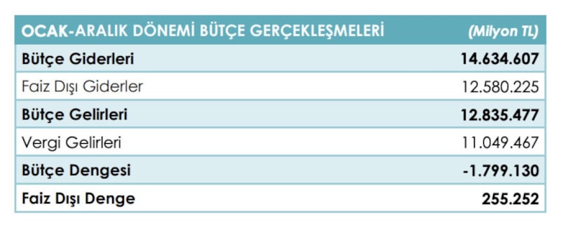 2025 yılı Ocak-Aralık döneminde merkezi yönetim bütçe giderleri 14 trilyon 634,6 milyar TL, bütçe gelirleri 12 trilyon 835,5 milyar TL ve bütçe açığı 1 trilyon 799,1 milyar TL oldu.