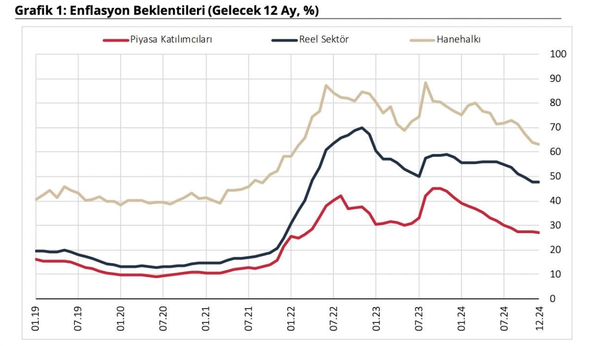Buna göre, 2024 yılı Aralık ayında 12 ay sonrası yıllık enflasyon beklentileri, piyasa katılımcıları için 0,1 puan azalarak yüzde 27,1 seviyesine, reel sektör için 0,2 puan azalarak yüzde 47,6 seviyesine, hanehalkı için 1,0 puan azalarak yüzde 63,1 seviyesine geriledi.