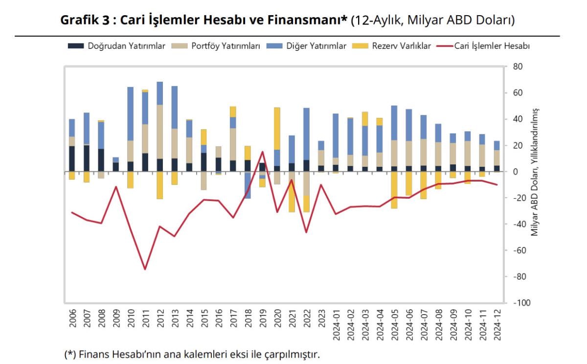 Finans Hesabı 2024 yılında cari açığın finansmanına net doğrudan yatırımlar 4,7 milyar ABD doları, net portföy yatırımları 11,7 milyar ABD doları ve krediler 26,2 milyar ABD doları katkı verirken; net efektif ve mevduatlar 14,0 milyar ABD doları, ticari krediler 5,4 milyar ABD doları negatif yönlü etki etti.