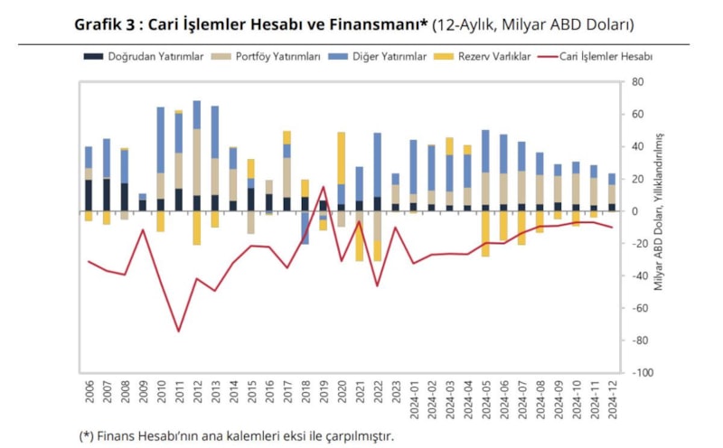 Finans Hesabı 2024 yılında cari açığın finansmanına net doğrudan yatırımlar 4,7 milyar ABD doları, net portföy yatırımları 11,7 milyar ABD doları ve krediler 26,2 milyar ABD doları katkı verirken; net efektif ve mevduatlar 14,0 milyar ABD doları, ticari krediler 5,4 milyar ABD doları negatif yönlü etki etti.